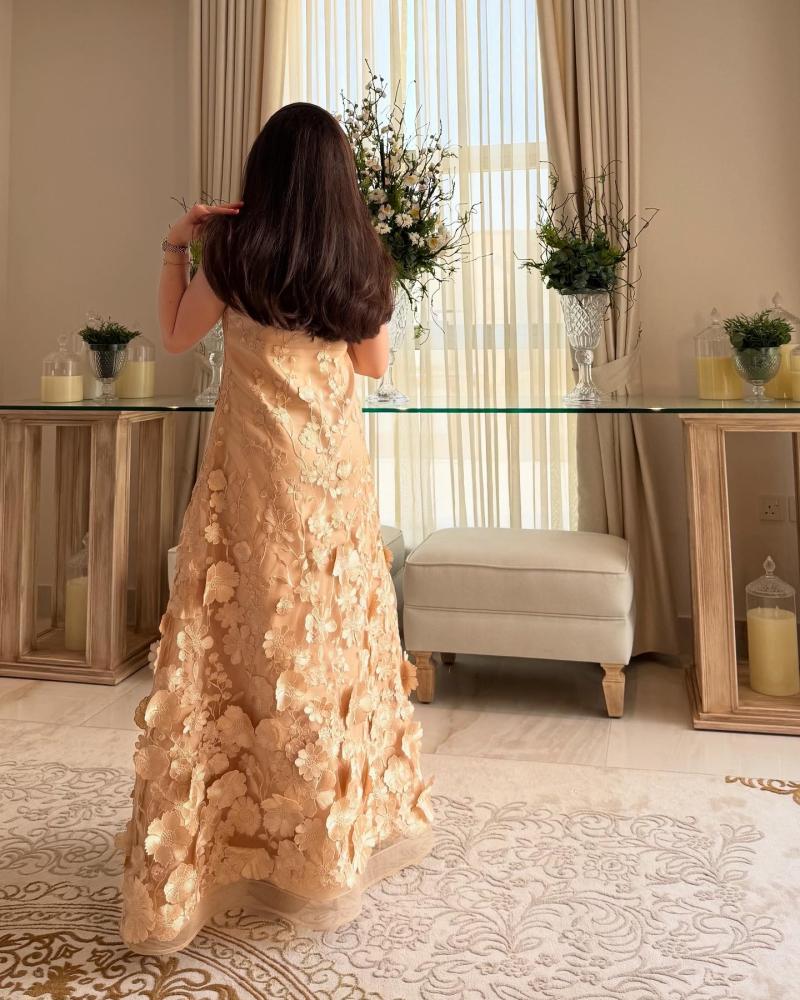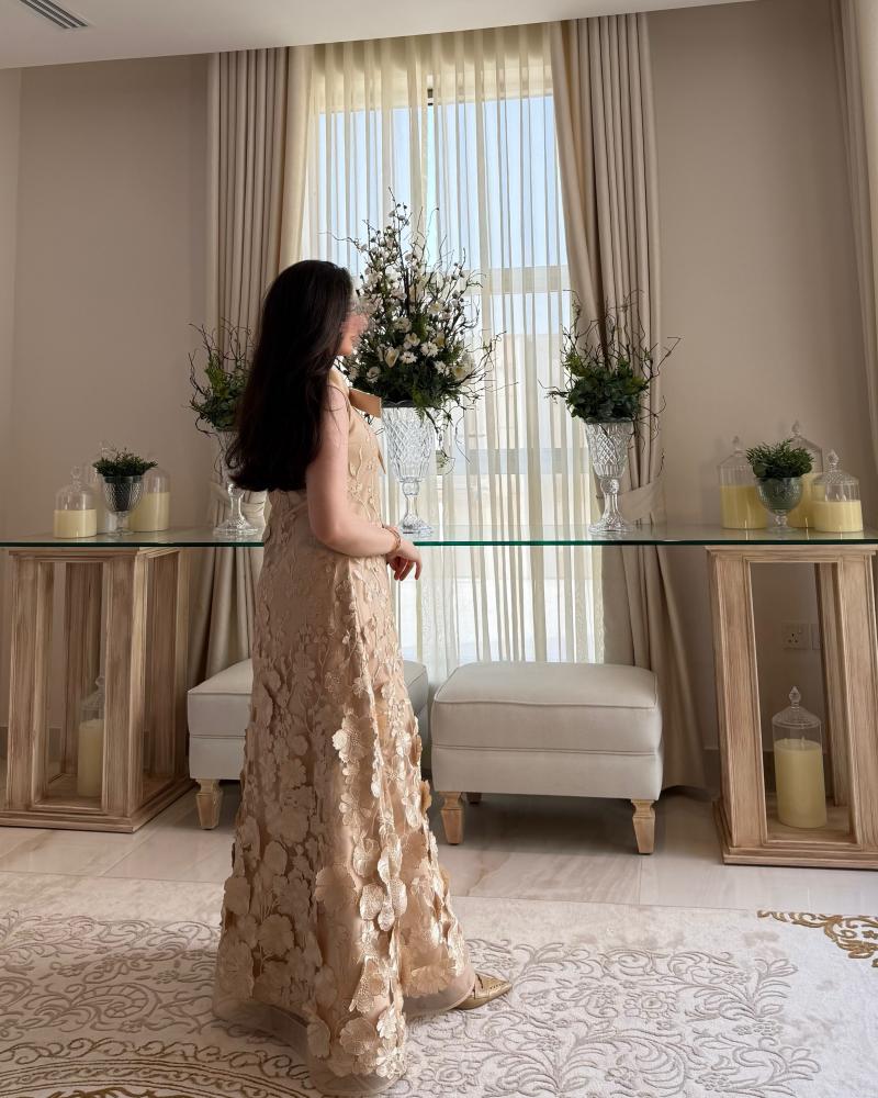 فستـان كلاسيـك قصـه كلوش ، القماش تفته إيطالي مع تطريـز ورد هاند ميد