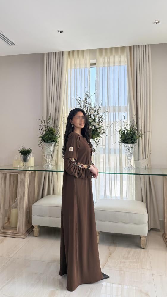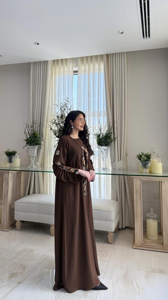 عباية أنيقة مصممة من كريب فاخر مناسب لصيف بلون بني دافئ، تتميز بتطريز يدوي فاخر من الخرز الملون بتصميم هندسي فني يزيّن الصدر والأكمام. تكتمل فخامتها بأكمام درابية ناعمة تعكس انسيابية التصميم وتمنحه لمسة أنثوية راقية